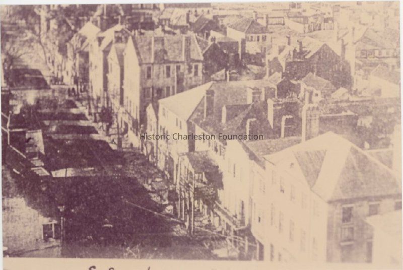 Reprint of a late-19th or early-20th century photograph showing an aerial view of Broad Street looking northwest, from 88 Broad Street, also showing 92 Broad and neighboring buildings.