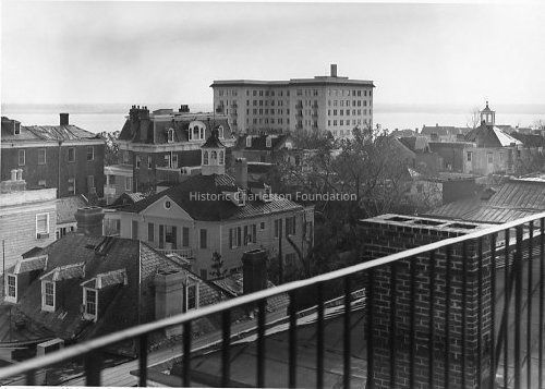 Aerial view of Charleston buildings after Hurricane Hugo, looking south. Landmarks include 1 King Street (f/k/a Fort Sumter Hotel), 20 South Battery, and 32 South Battery cupola. B&W photograph.
