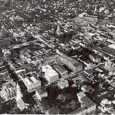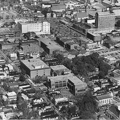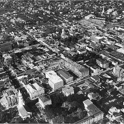 16: Looking south on Meeting Street and east to the Cooper River. Features L. Mendel Rivers Building, Joseph Manigault House, site of the Gaillard Auditorium, edge of Marion Square. Attributed to R.A. Nettles.