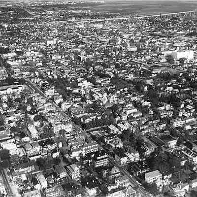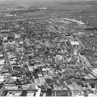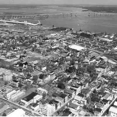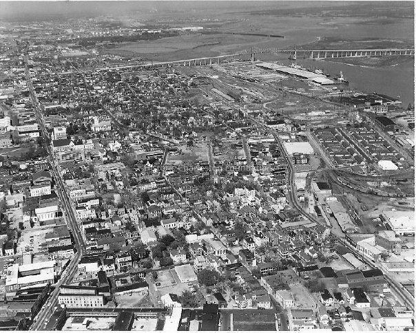 19: Looking northeast toward Grace Memorial Bridge and the Cooper River from Meeting Street. Gaillard Auditorium site at left-center. Ansonborough Homes housing project right. Attributed to R.A. Nettles.Collection