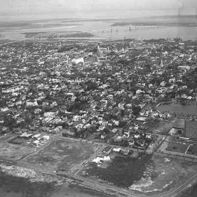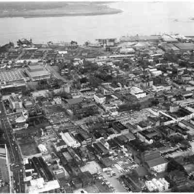 17: Looking southeast, from St. Philip Street? (bottom right) to the Cooper River. Features Marion Square, L. Mendel Rivers Building, 404 King Street library, and port facilities. Attributed to R.A. Nettles.
