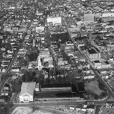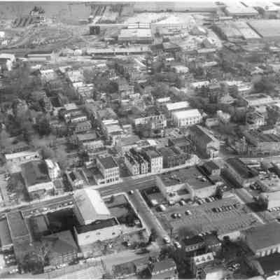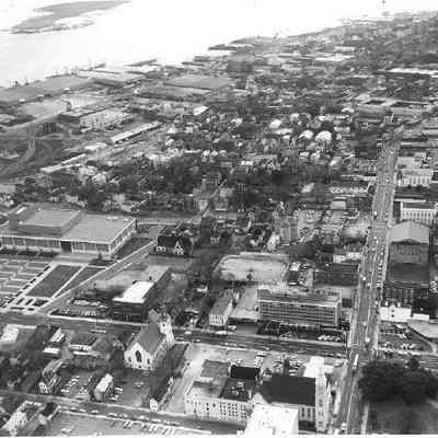 14: Aerial view showing Meeting Street and the area north west of Meeting, Civic Square/Four Corners of Law (bottom left), Colonial Lake (upper left), ca. 1969.