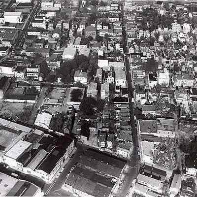 6: Looking northwest at area showing Calhoun Street (extreme top right), Broad Street (left), Church Street (bottom), and Meeting Street (right center). Taken at 750 ft. alt. (2 copies of photo in sleeve.)