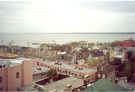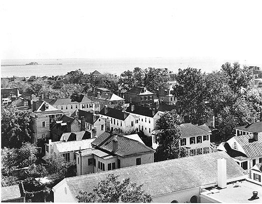1: B&W view looking east over Charleston rooftops, toward the Cooper River. Photograph by Julien Metz. 8x10.
