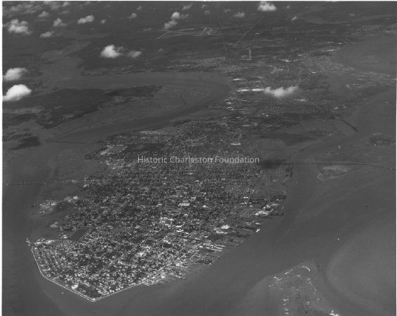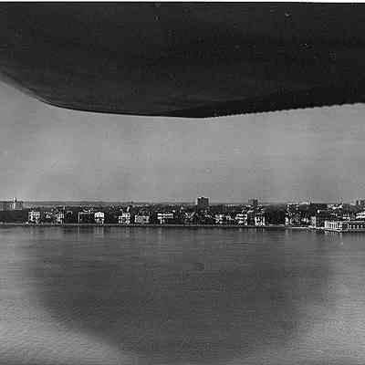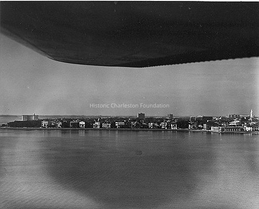 4: Aerial view of peninsula looking west towards East Battery/East Bay Street, Wing of airplane at top of photo. Missroon House at left. B&W photo, 8x10. Undated, unattributed.