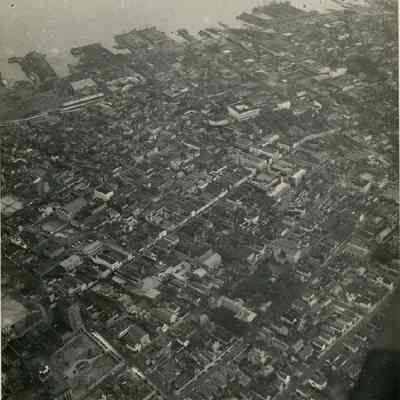 b: Oblique view south at the area loosely bounded by Calhoun Street, Coming Street, and Market Street, extending southeast to the ports and piers on the Cooper River. King Street to just south of Market Street bisects the photograph. Notable buildings and areas include almost the entire College of Charleston Campus (before Glebe and Green Streets were closed off), Wilson-Sottile House, Sottile Theater, and Randolph Hall; Mt. Zion A.M.E. Church; the Charleston Orphan House; Francis Marion Hotel; Marion Square (and a house on the south edge and one on the west edge); Charleston Hotel; Marks Building; Washington Light Infantry; St. Phillip Street police station; Bennett Rice Mill; Memminger School; almost all of Ansonborough; the U.S. Customs House; Market Street sheds; and much more.Collection