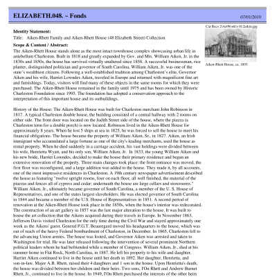 Related Units of Description: In addition to the items cataloged with the ELIZABETH.048. prefix, see also various photograph collections; catalog records for objects at the Aiken-Rhett House; Earthquake Damage Report; and HCF brochures, annual reports, and invitations. As additional related items are cataloged, they will have the subject heading Aiken-Rhett House and/or Aiken-Rhett Family. See the Related tab.