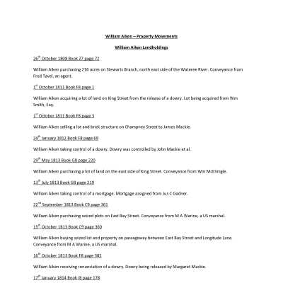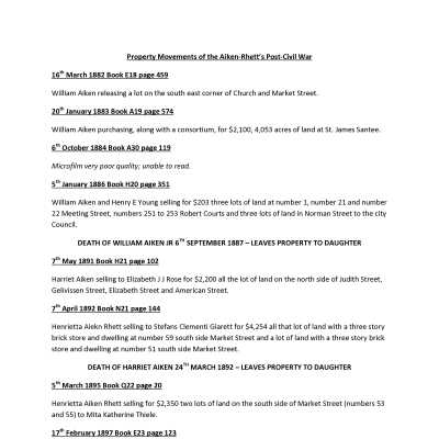 ELIZABETH.048.1: Primary Source Documents (historical, biographical, and architectural primary source material directly relating to the Aiken and Rhett families, and the Aiken-Rhett House, Jehossee Island, and related properties). Note: summaries of the movement of Aiken land holdings on Media tab.