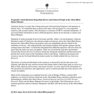 Frequently Asked Questions Regarding Slavery and Enslaved People at the Aiken-Rhett House Museum (HCF, 2016) (see PDF on Media tab).Collection