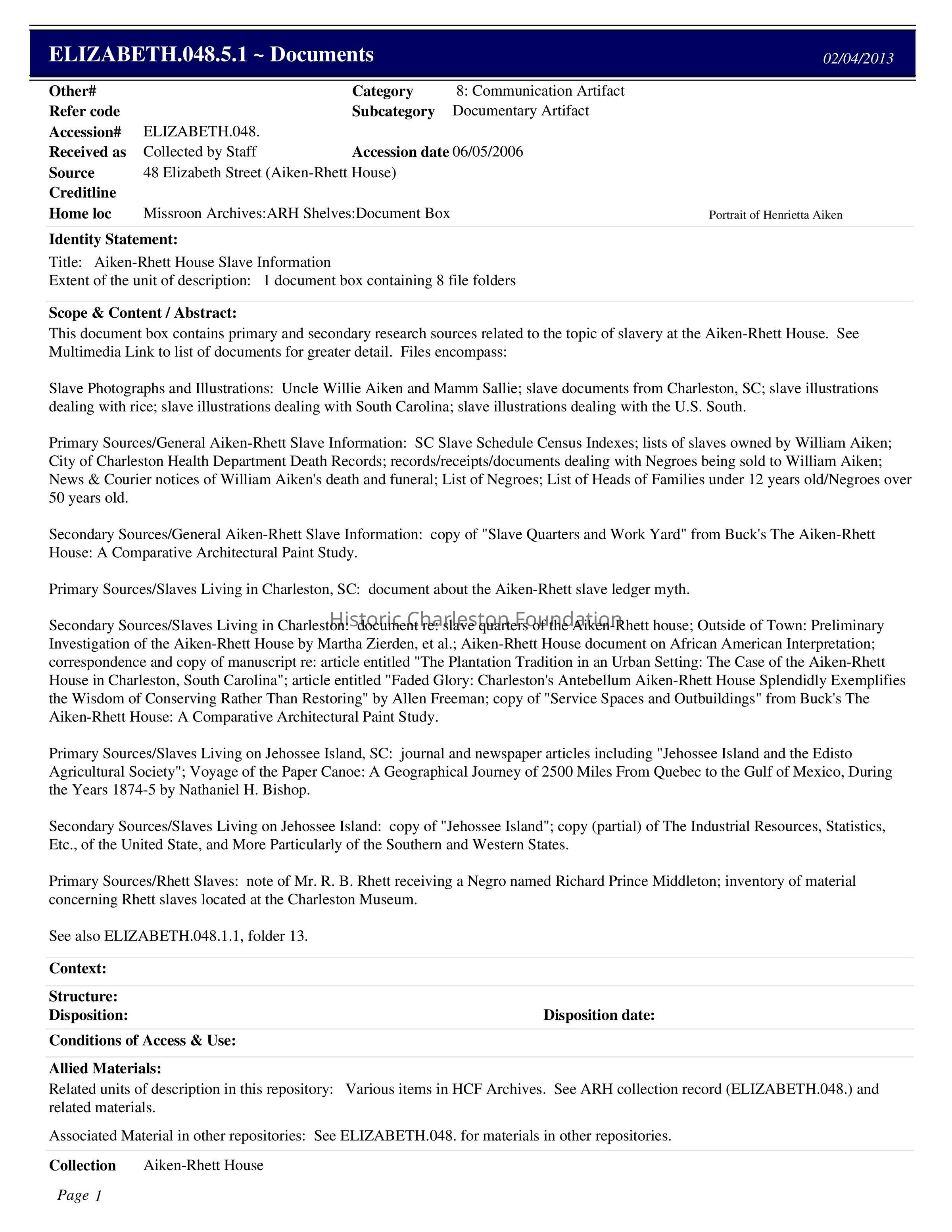 Contains primary and secondary documentation related to the enslaved Africans and post-Civil War servants at the Aiken-Rhett House. Largely compiled in 2012 by Bridget O'Brien, HCF Preservation and Museums Coordinator, with contributions by other HCF staff members in previous years. (See overview of the research on the Media tab.)
