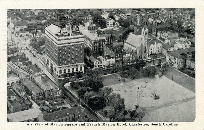 B&W photographic postcard showing an aerial view of Marion Square and the Francis Marion Hotel. Also includes King Street buildings between the hotel and St. Matthews Lutheran Church that no longer exist; buildings west of King Street and south of Calhoun Street; the west wing of The Citadel; the Charleston Orphan House; Calhoun Street, etc.Collection