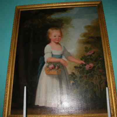 By Edward Savage C.1797 Full Length Portrait of a Young Girl in White Dress with Blue Sash, Red Shoes, Holding a Basket of Pink Flowers on Right Arm. with Her Left Arm She Picks Pink Flowers From a Plant At Right Corner of Canvas. Palmetto Tree in Left Background with Blue Sky in Right Upper Background.