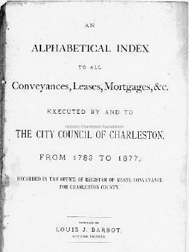 Photocopy of the original volume entitled An Alphabetical Index to All Conveyances, Leases, Mortgages, &c. Executed By and To The City Council of Charleston, from 1783 to 1877, Recorded in The Office of Register of Mesne Conveyance for Charleston County.