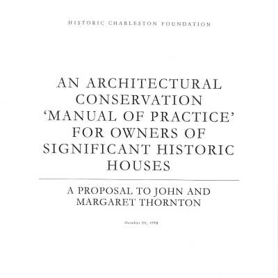 A template for historic home owners to guide them through the long-term stewardship of their homes. Includes procedures for historic structure analysis, archaeological investigation, and conservation. Initially prepared as a proposal to the owners of 14 Legare Street but now serves as general guidelines for owners of historic homes protected by easements. This document has been incorporated and referenced in all HCF Deeds of Conservation Easements written after 1998.
