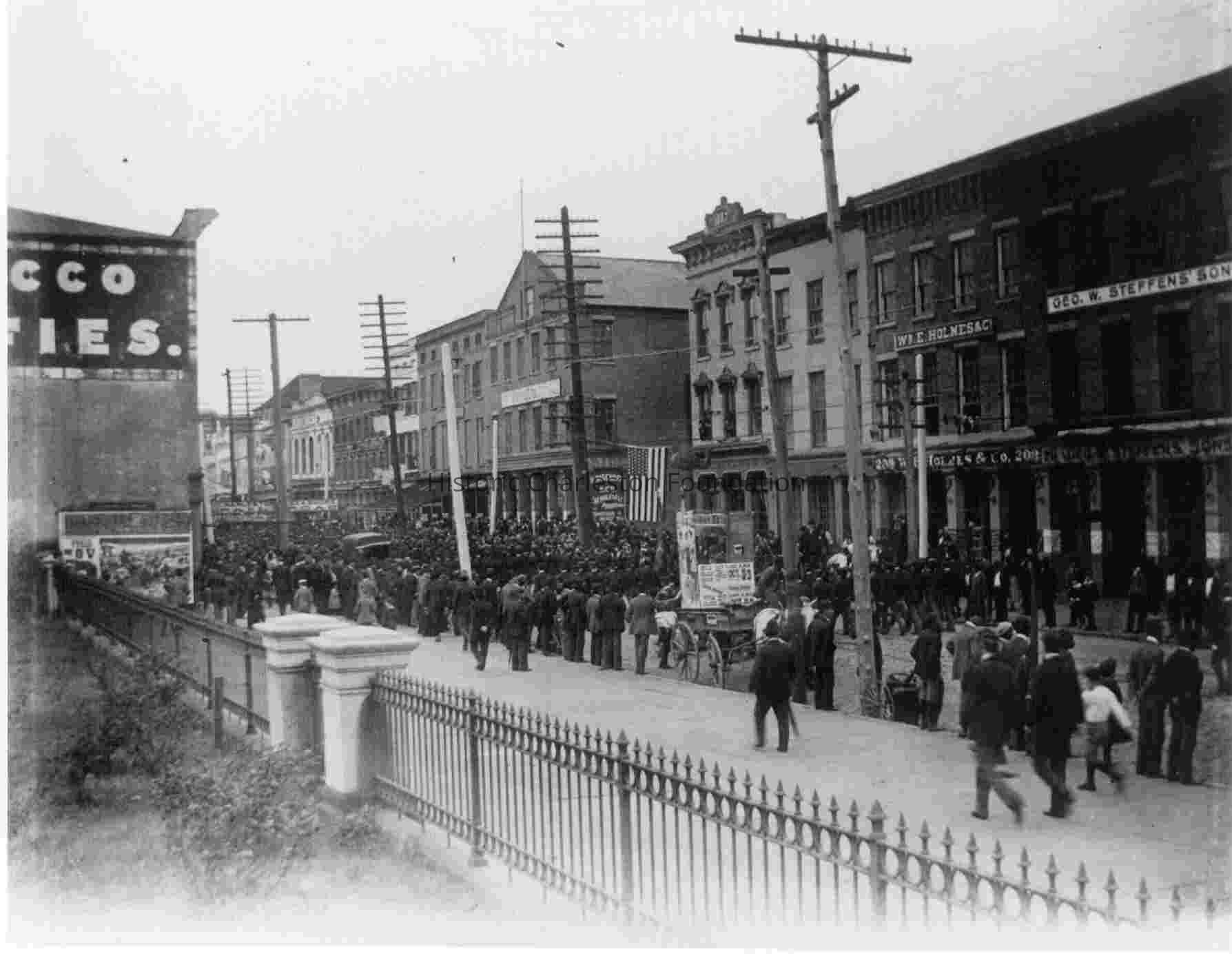 Identified as Anderson's Battery marching on East Bay Street (near Market Street). Shop signs include Geo. W. Steffens Sons, Wm. E. Holmes and Co., H. Bischoff and Co. Wholesale ______, located at ca. 199-211 East Bay Street.Context
