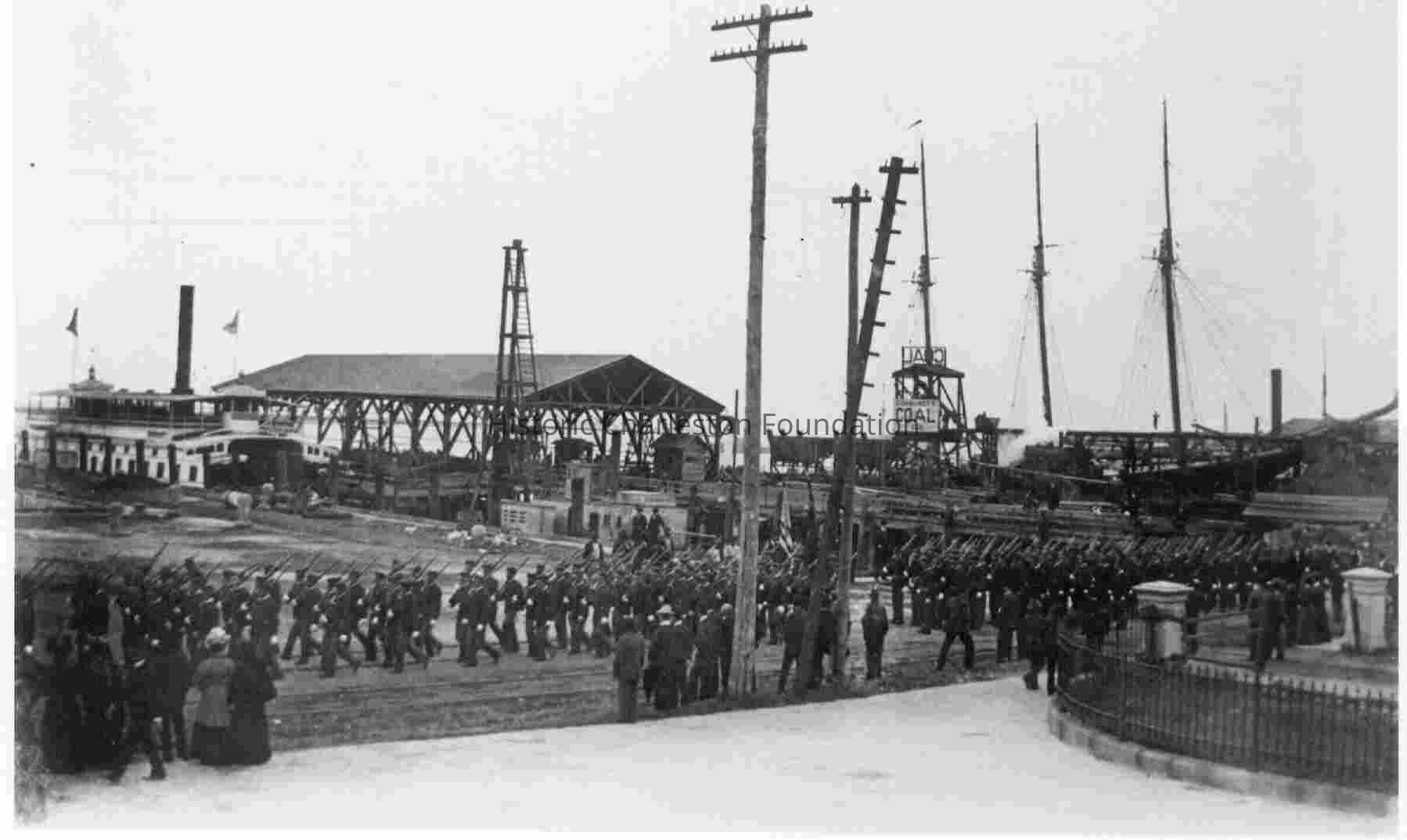 Anderson's Heavy Battery marching on by the wharf behind the Customs House, what is Concord Street today. Consumers Coal Company tower in background (located on Faber Street between East Bay and Concord Streets).Context