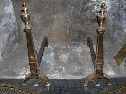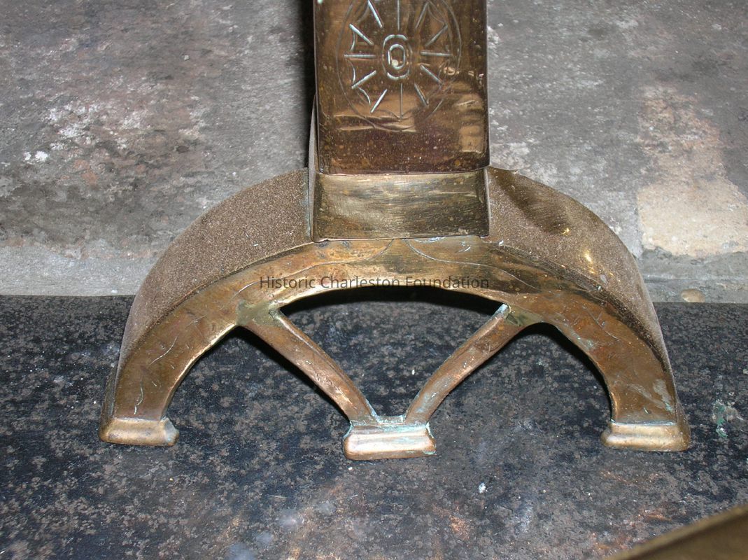 Brass and rod iron andirons, urn finial on tapered square shaft with engraved bell flowers, Plinth column has