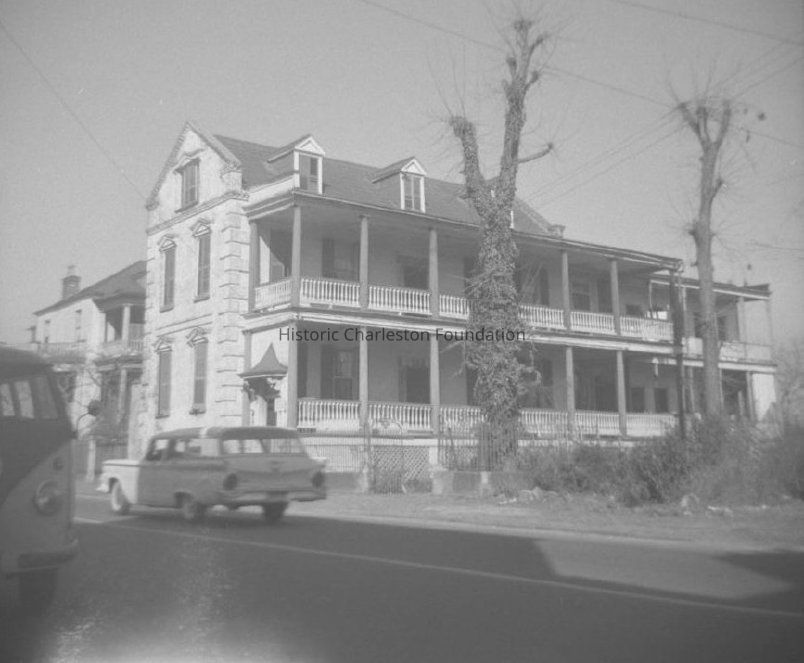 B&W photograph of the Andrew Moffett House (328 East Bay Street, before its rehabilitation by Historic Charleston Foundation. Viewed from across the street to the south, showing the southwest elevations (corner view) and two cars driving by.