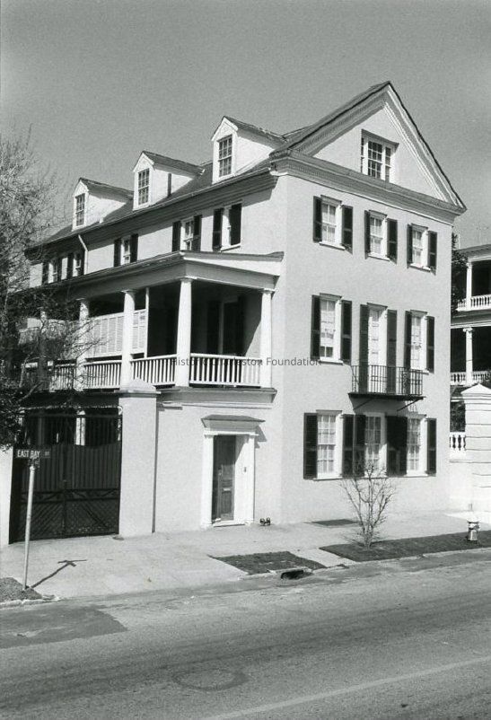 B&W photograph of the Anne Boone House (47 East Bay Street), front (east) elevation showing the southeast corner of the building and piazzas. Street sign for East Bay Street and Stoll's Alley at left.