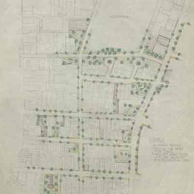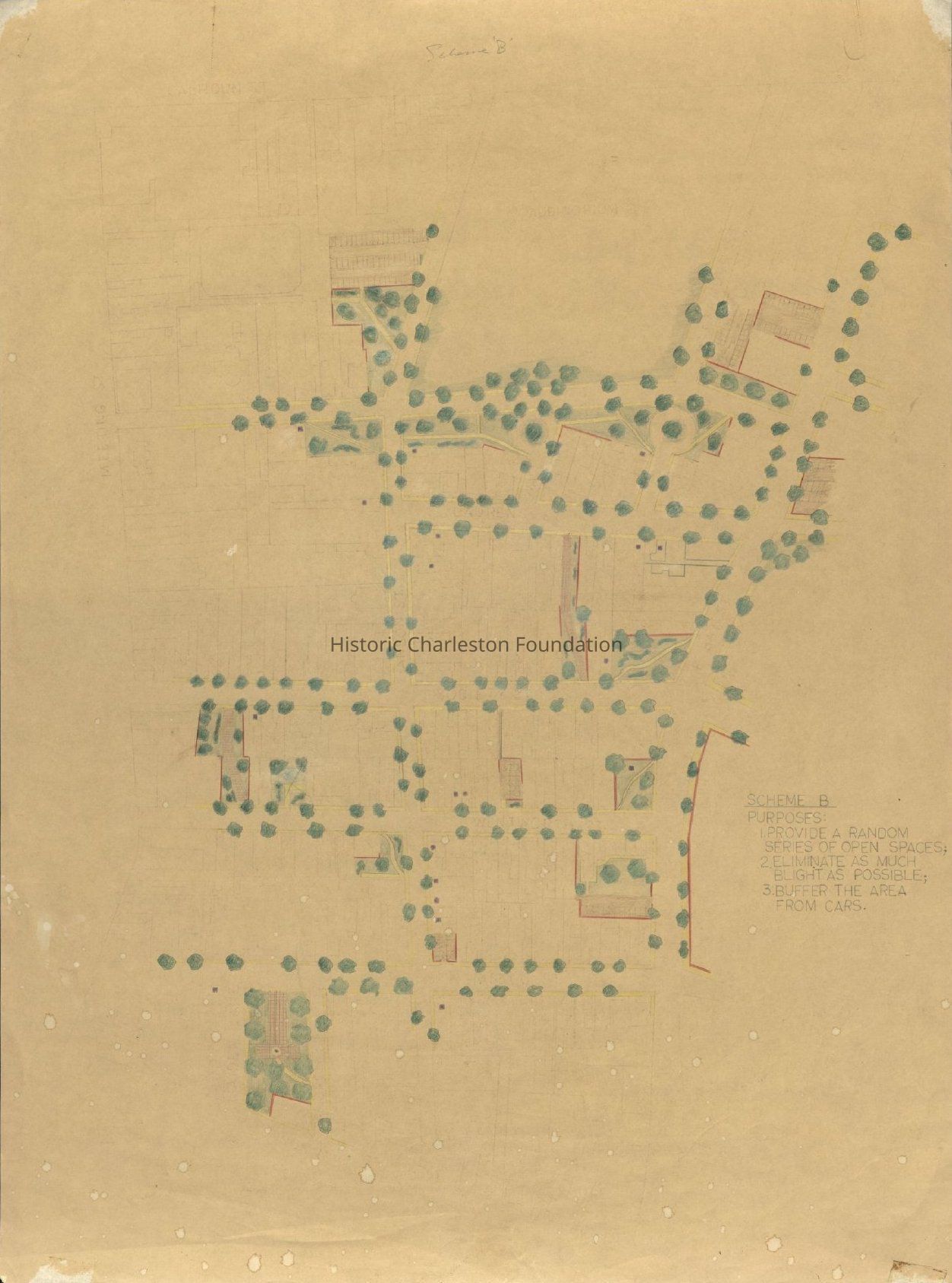 Sheet 4: Scheme B. "Purposes: provide a random series of open spaces; eliminate as much blight as possible; buffer the area from cars."