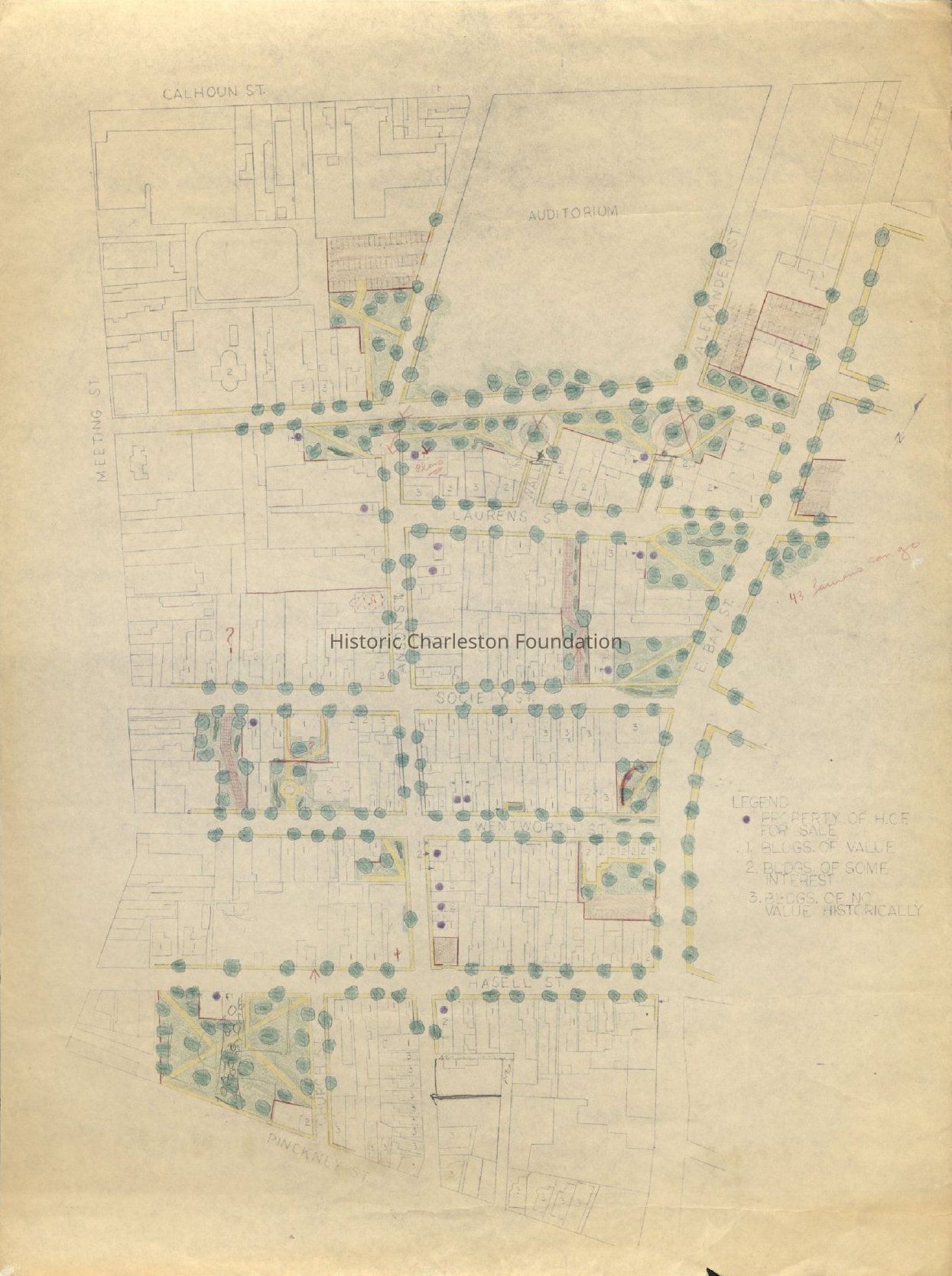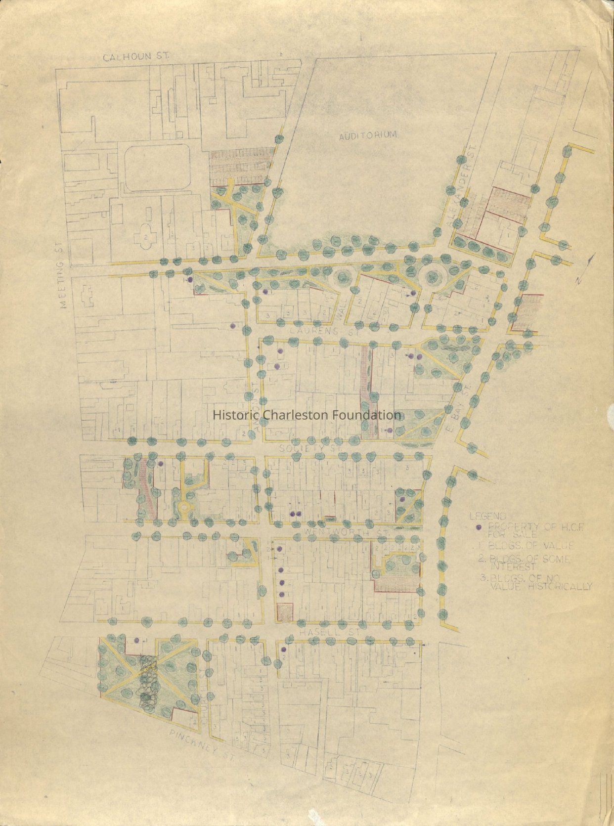 Sheets 1-2: Annotated to show Historic Charleston Foundation-owned properties that were for sale; "buildings of value"; "buildings of some interest"; and "buildings of no value historically."