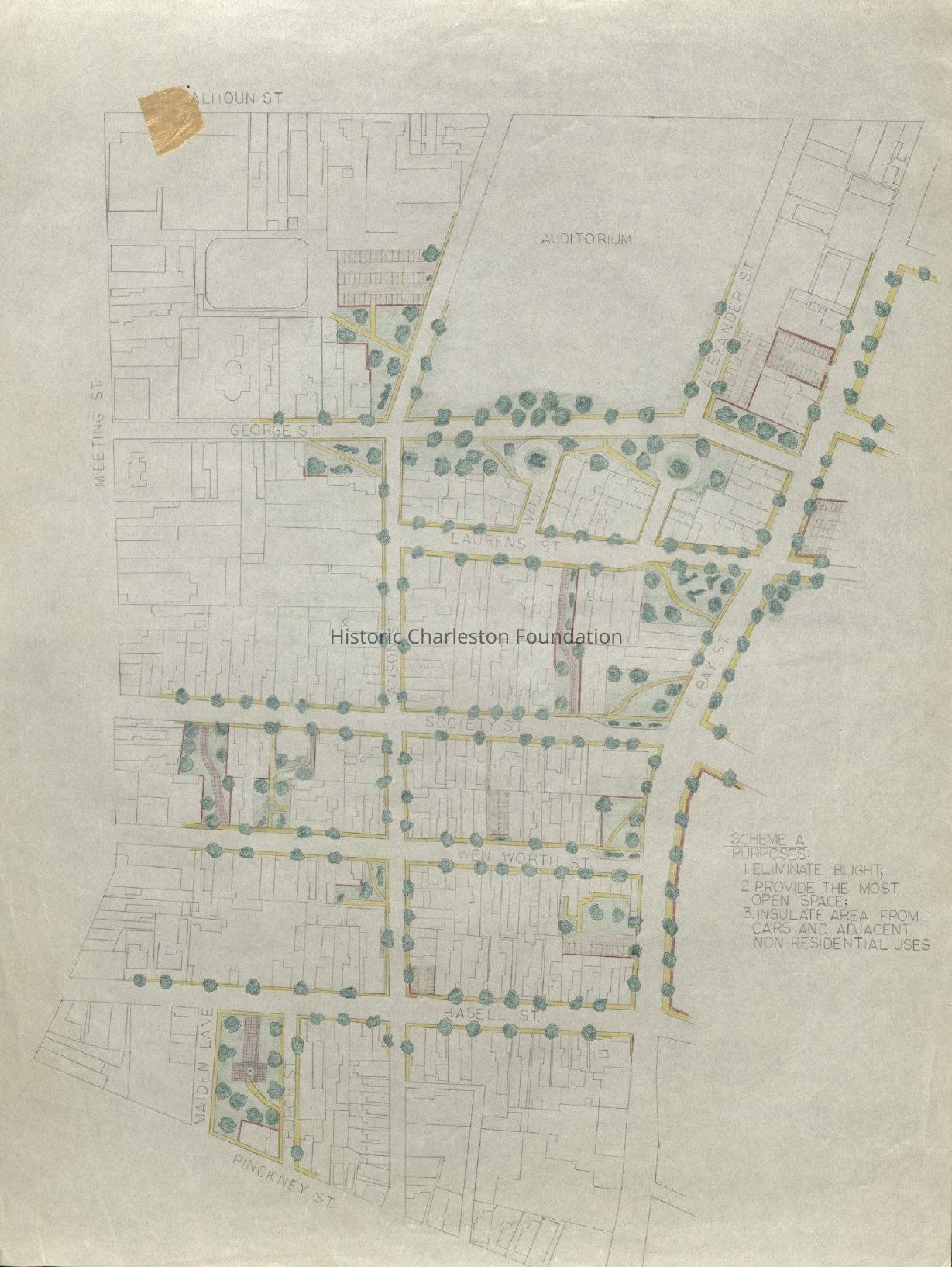 Sheet 3: Scheme A. "Purposes: eliminate blight; provide the most open space; insulate area from cars and adjacent non-residential uses."