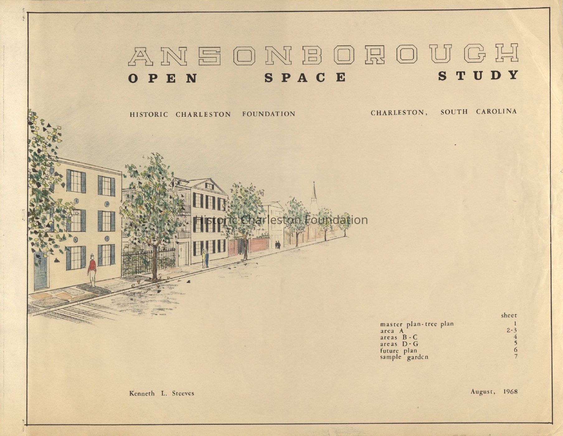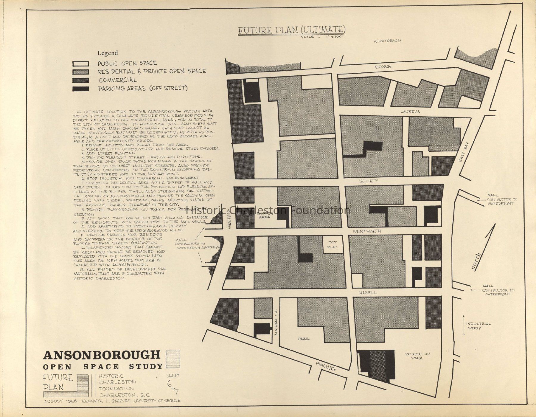 Ansonborough Open Space Study is an illustration in support of the report of the same name, created for Historic Charleston Foundation by Kenneth L. Steeves in August, 1968.