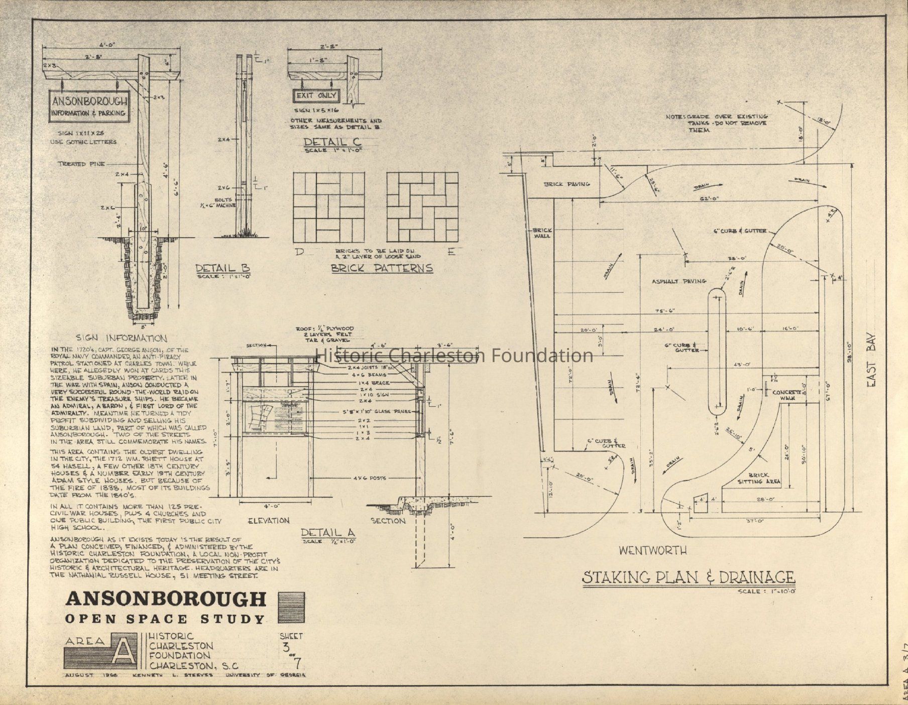 Sheet 3: Area A Staking Plan and Drainage, Details, Brick Patterns, and Sign Information.