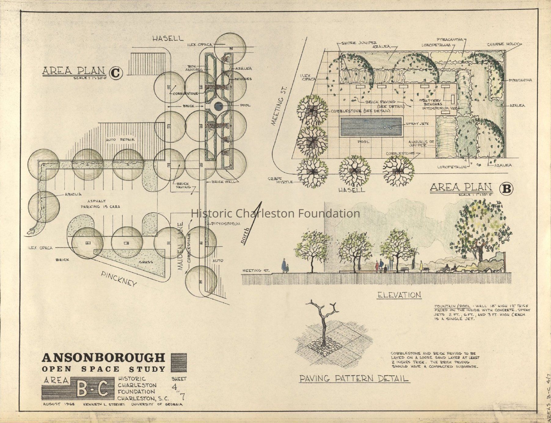 Sheet 4: Areas B-C [landscape] Plan, Elevation, and Paving Pattern Detail.