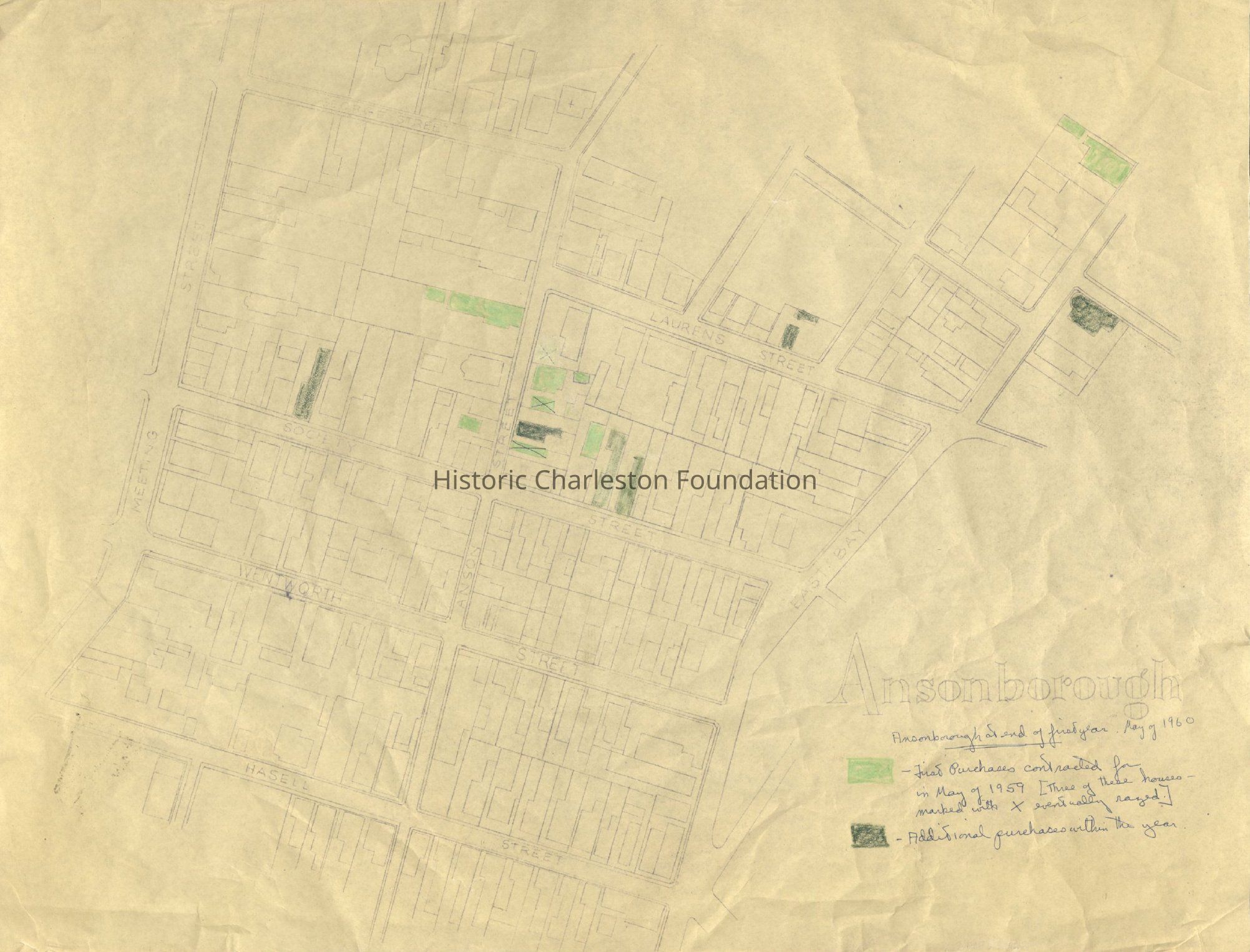 Sheet 1: "Ansonborough at end of first year, May of 1960," identifying the first purchases contracted for in May of 1959 and additional purchases within the year.