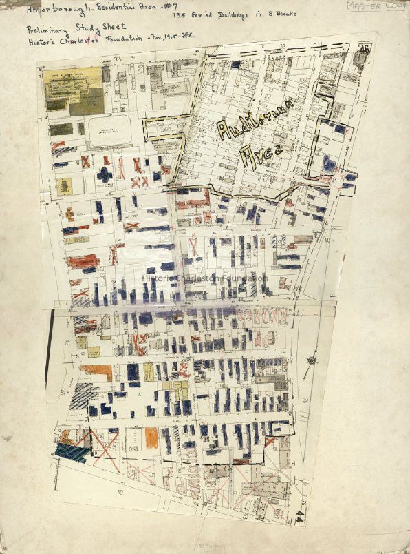 Map 1 is the most complete map, showing the area where the Municipal Auditorium (now Gaillard Auditorium) would be constructed. Created by F.R.E. (Frances R. Edmunds), November, 1965. (See 2008.001.22 for key to color-coding.)