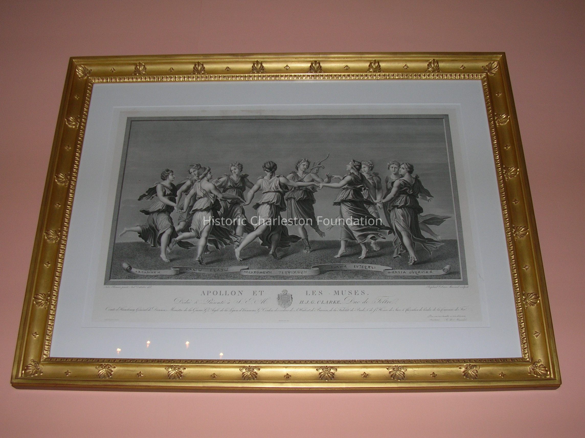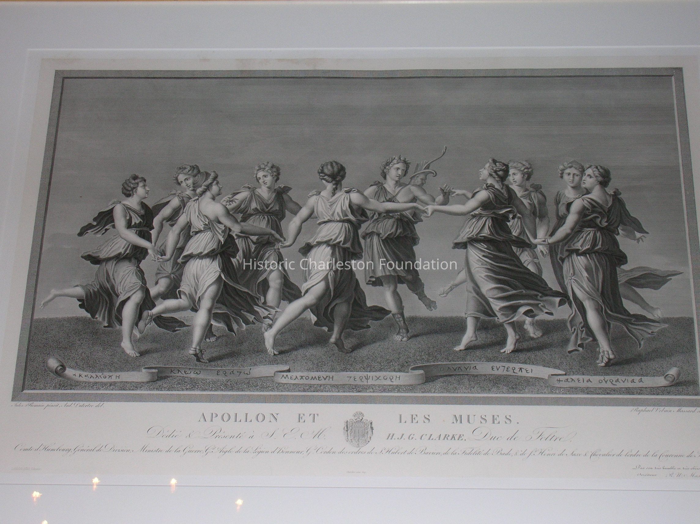 Engraving, "Apollon Et Les Muses" or Apollo and the Muses. Apollo is dancing in a circle with nine muses. They are attired in classical dress.