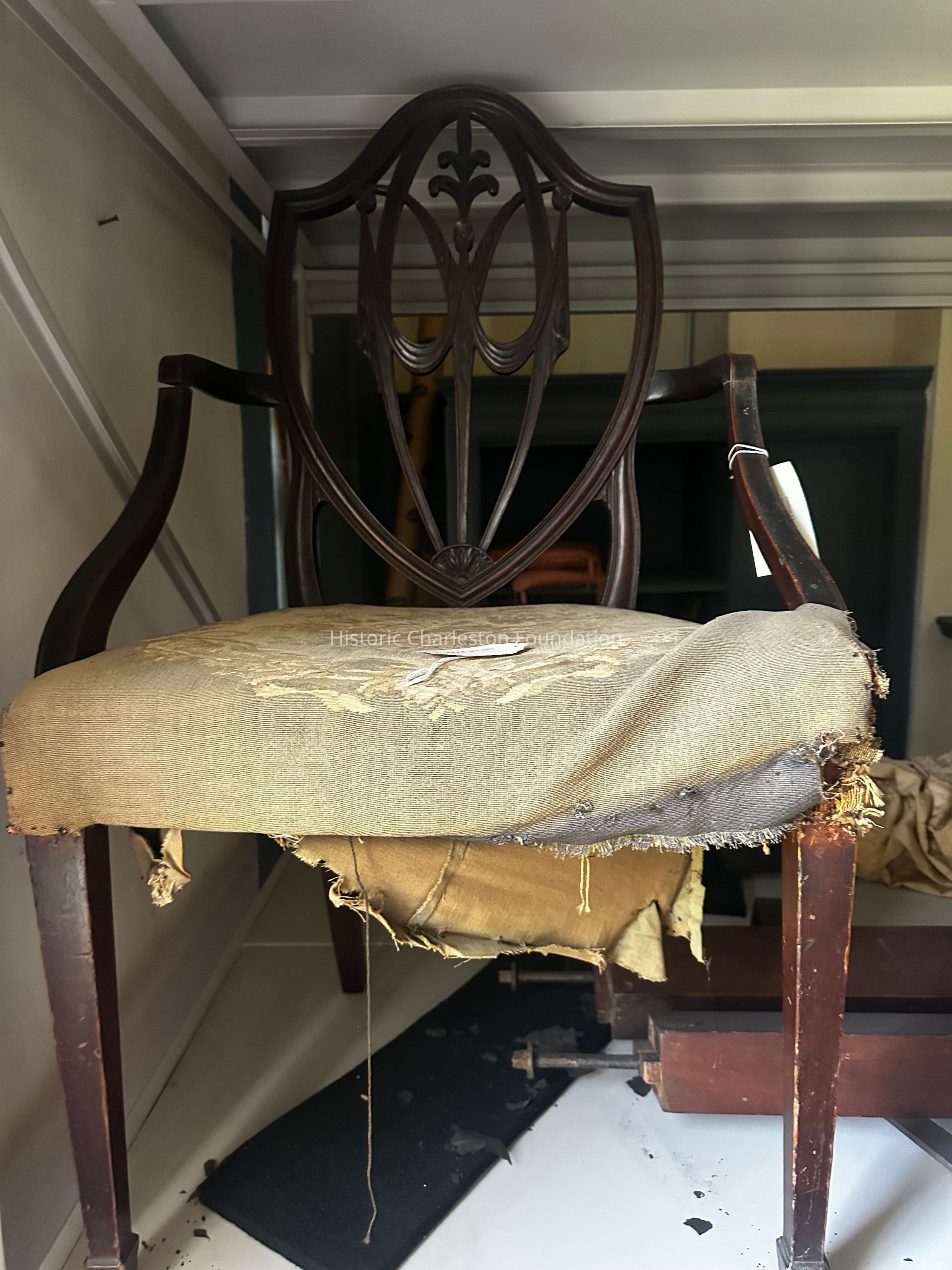 Mahogany Armchair, C.1790, with Ornately Carved Shield Back with Drapery Swags, Tapered Straight Legs with Spade Feet, and Attenuated Arms. Made in Charleston, Inscribed "I C Ball" on Bottom Covering.