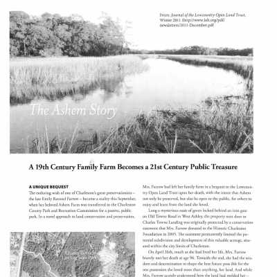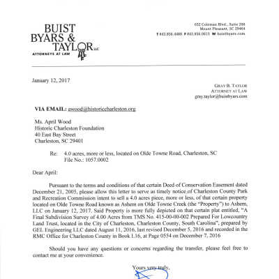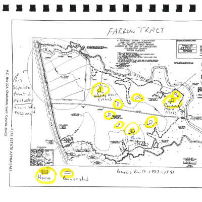 Three files containing documentation of the easement on the property (exterior and open space); newspaper and journal articles; National Register Nomination form; documentation of the subdivision of the property sold to Lowcountry Open Land Trust; article "Old Town and its Vicinity" by Henry A.M. Smith (SC Historical & Genealogical Magazine); report related to plat evidence of a cemetery near the Caretaker's House, entitled "The Pinckney Plat Mystery: Solved?" (Hiatt, CTL, 2021).