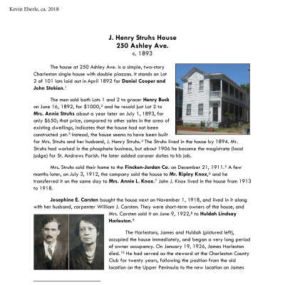 Ashley Avenue was first laid out as Lynch Street, for Thomas Lynch, in 1770, as one of the streets of the Village of Harleston. After the Revolution, the street from Calhoun north was called Paine or Payne. In 1791, as it crossed Elliott (now Spring Street) Street, it was called Thomas. The street from Line Street to Congress, in the Village of Washington, was called Legare Street. In 1869, Lynch Street was extended south to Broad Street, and still later to Tradd. In 1897, the name Ashley Avenue was applied to the length of the street. (Source: Charleston Streets, website)