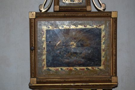 Wall clock or banjo clock with brass finial, metal face, glass cover, eglomise panels, mahogany case, gilt wood plinth.Collection