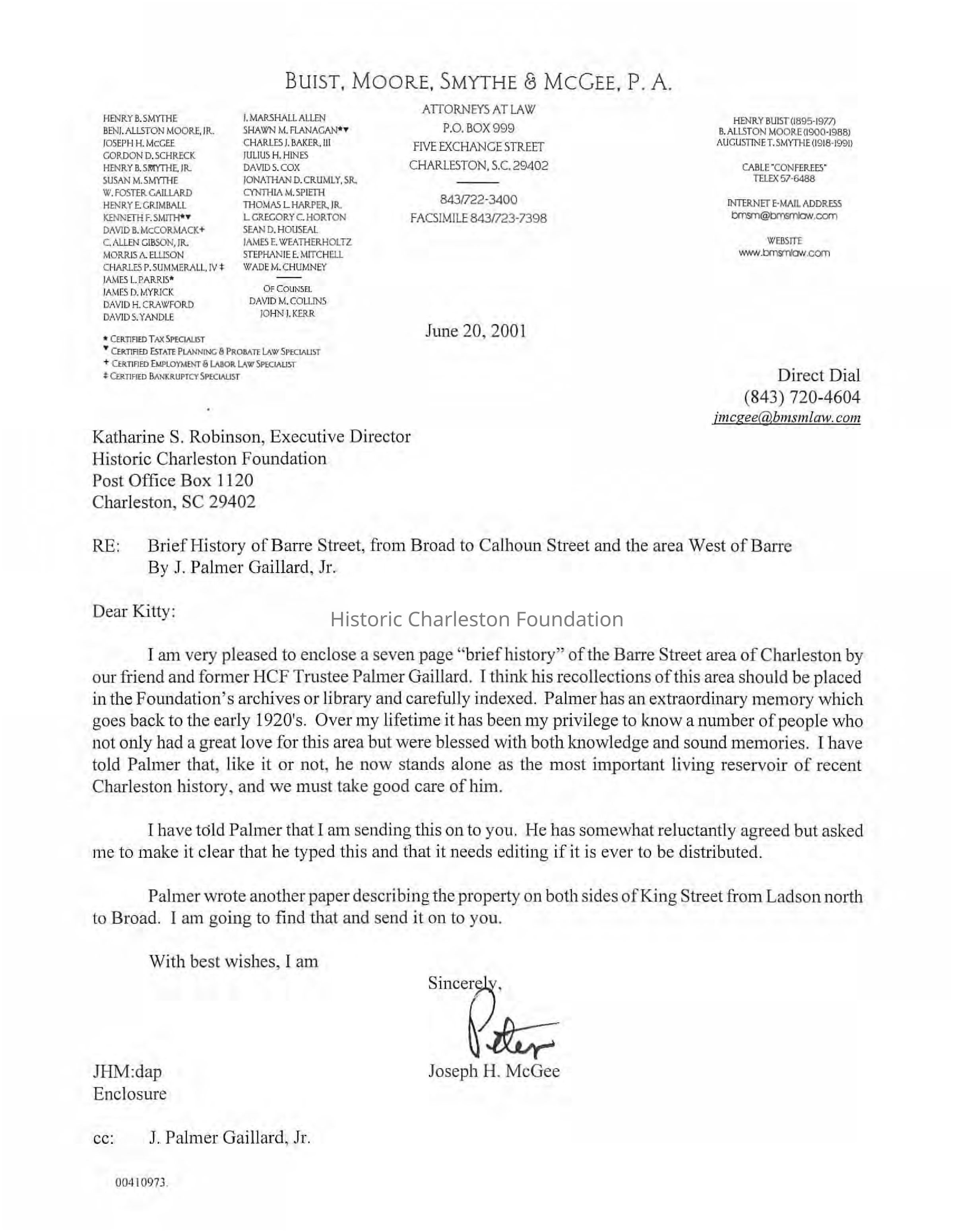 File contains "Brief History of Barre Street, from Broad to Calhoun St., Also the Area West of Barre to What is Now Lockwood Drive" by J. Palmer Gaillard Jr. (2000) which includes photographs of Anderson Lumber Co. office at the corner Broad and Chisolm, Anderson Lumber Co. entrance at the west end of Broad Street, schooners waiting to be loaded at Anderson Lumber Co., looking northeast from the Ashley River-Anderson Lumber Co. mill pond, West Point Rice Mill (ca. 1926), yacht basin under construction (1960).Collection