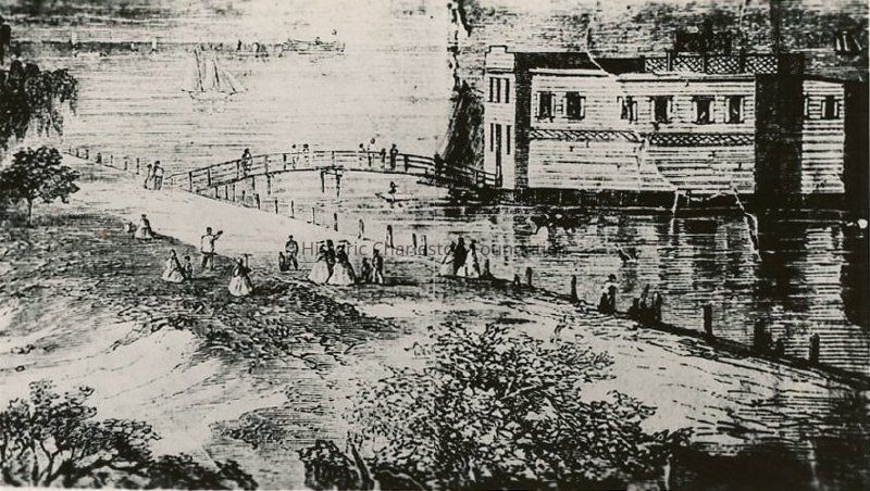 Photographic reprint of an engraving of the Bathing House at White Point Gardens.