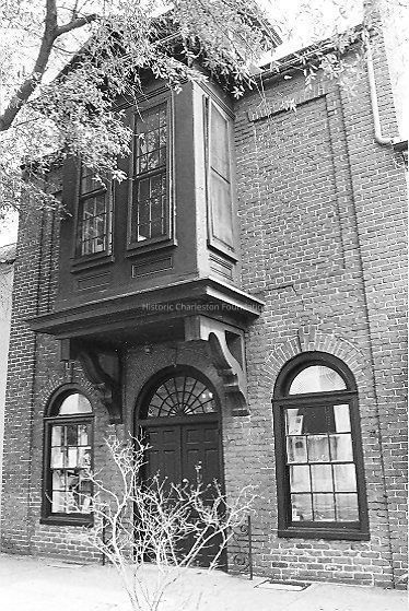 B&W photograph of the front of 118 East Bay Street, part of Coates Row, front (east) elevation featuring the projecting two-story bay, door, and windows.Collection
