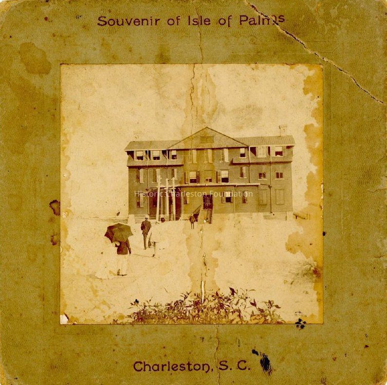 Late 19th century souvenir photograph of what appears to be the rear of a hotel or resort on a beach, perhaps at Isle of Palms. People are walking toward the building on a boardwalk.Collection