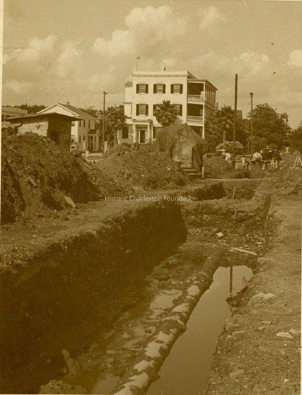 Photograph (scan) showing the work being done under a WPA project to improve drainage facilities at the west end of Beaufain Street. 4 Gadsden Street in background.