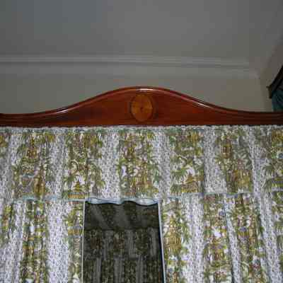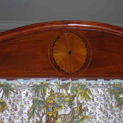 The inlaid fans on the legs are similar to those found on a Charleston "cabinet" in the Baltimore Museum of Art (see E. Milby Burton, "Charleston Furniture: 1700-1825" [University of South Carolina Press: Columbia, SC 1970], fig. 67). While there are no published (as of 1991) examples of bedsteads with fans inlaid in a similar way, approximately a half dozen examples have been documented to date by the Museum of Early Southern Decorative Arts. Other distinctive Charleston features include the notched mahogany rails and the sliding headboard.