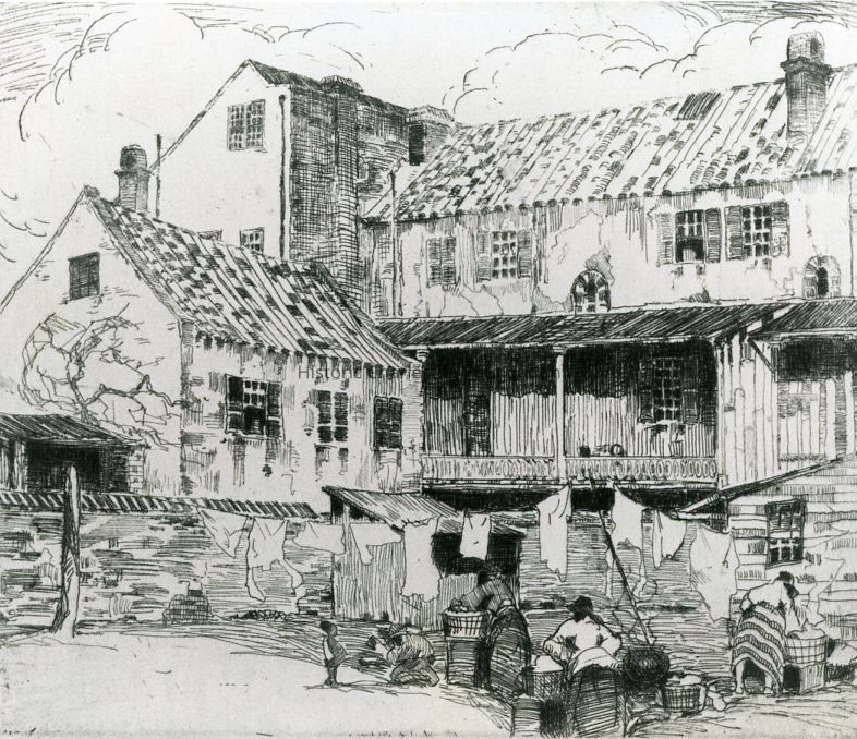 Photographic reprint of a 1921 etching by Albert Hutty, entitled "Bedon's Alley." Features the rear lot of 99-101 East Bay Street seen from Bedon's Alley, where women are doing the laundry. Also features the rear view of 99-101 East Bay and its outbuilding.Collection