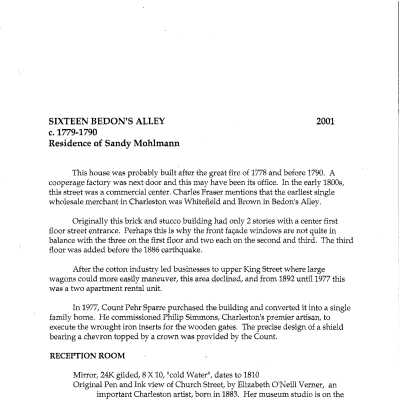 From Charleston's Streets website, origin of name: Bedon's Alley was in existence by 1704, when it appeared, unnamed, on the Crisp Map. The "Ichnography" of 1739 identifies it as Middle Lane. Deeds as early as 1733, however, refer to it as Beadon's or Bedon's Street or Alley. It was named for George Beadon (Bedon), a merchant who owned land in the little street. The fires of 1740 and 1778 swept through the alley, presumably destroying all structures.