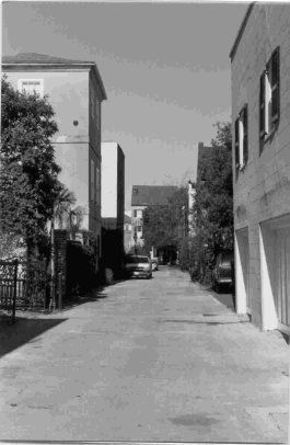 Developed 1704-88. By the 1730s this small street, then called Middle Lane, contained a mix of mercantile stores and ship chandleries, but its development was stymied by heavy damage in the fires of 1740 and 1778. After the latter fire wealthy contractor Humphrey Sommers built the 3-story stucco building at 2 Bedon's Alley as a tenement with shops on the first floor and a residence above. Merchant James Cunnington's narrow structure of a decade earlier at 5 Bedon's Alley had similar usage with a countinghouse on the first floor and elegant residence above. The 3-story south wing was added in 1794. Tradition holds that America's oldest musical organization, the St. Cecilia Society, was founded in this building. Most of the small brick houses on the east side of the street were built as outbuildings for the large establishments in Rainbow Row. 8 and 10 Bedon's Alley, for example, provided service functions for Scottish merchant Adam Tunno's large office and residence at 89 East Bay Street. These structures were rescued in the 1920s and 1930s by Susan Pringle Frost and renovated as modern dwellings with detailing and landscape treatments in the Colonial Revival style. (Poston, Buildings of Charleston.)