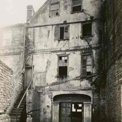 b: Rear (west) elevation seen in disrepair. Shows the rear entrance, broken and missing windows, and crumbled brick on the ground in front. Written on back: "Rear view, from patio garden. Note outside stress now gone and most of high walls torn down."