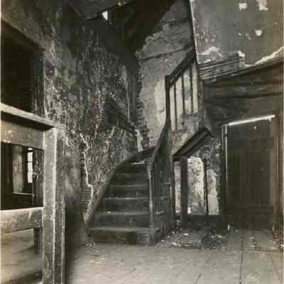 c: Identified as the second floor hall seen in disrepair. Features the staircase and a doorway. Written on back: "Second floor hall, note additional outside entrance from first floor. Now filled in with a window."