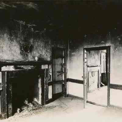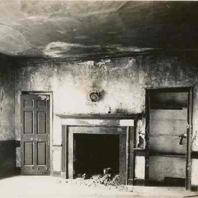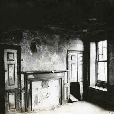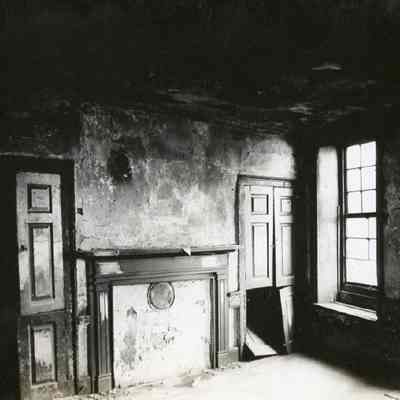 e: Identified as the front drawing room, seen in disrepair. Features the fireplace, mantel, and door. Written on back of photo: "Front (Drawing) room. Note cupboards removed and the fireplace changed to a [bolection?] style during 1939 renovation."