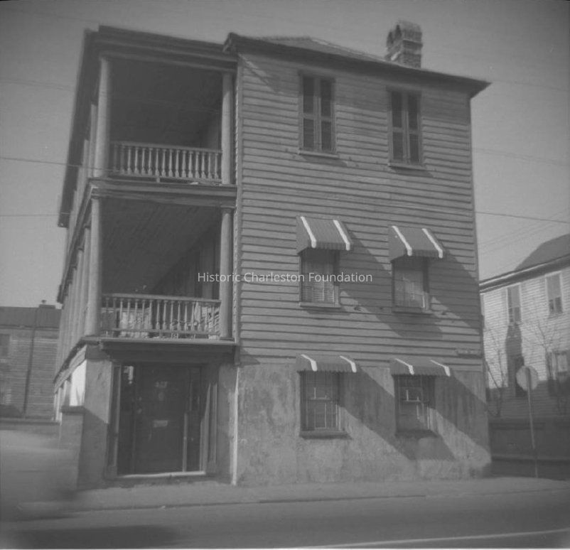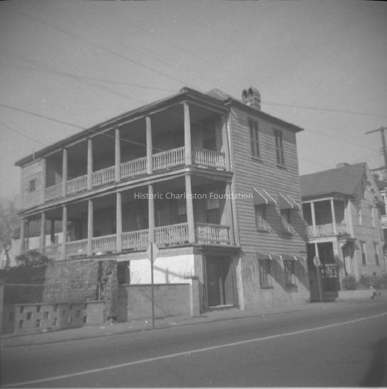 b: Southeast corner of the building, showing the piazzas, viewed from across the street. Shows the piazzas. Also shows a portion of the house located at the northwest corner of East Bay and George Streets, 319 East Bay Street (later demolished). "ARP" [Ansonborough Rehabilitation Project] written on back of photograph.Collection