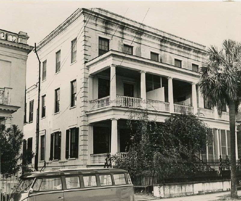 B&W photograph of the Benjamin Smith House (64 Hasell Street), corner view, south (front) and west elevations. Volkswagen Bus parked on the street.Collection